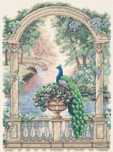 Framed by an arch of classical proportions, a serene landscape beckons. The fabulous peacock adds an exotic note. The subtle half cross stitch background adds to the dream-like atmosphere. This kit contains cotton thread, 14-count ivory Aida, thread palette, needle, and easy instructions. Finished Size: 12 by 16 inches