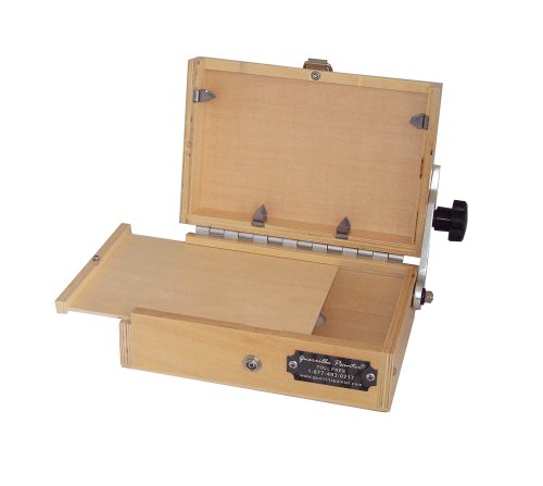 Our smallest pochade box is perfect for artists who want a box they can take anywhere or who don't want to draw attention to themselves while painting in public. Thumb hole in the bottom for holding by hand. Holds up to two wet 5 by 7 panels in the lid. Storage compartment under the sliding palette. Pre-drilled holes for optional universal tripod mount and bumper feet on bottom.